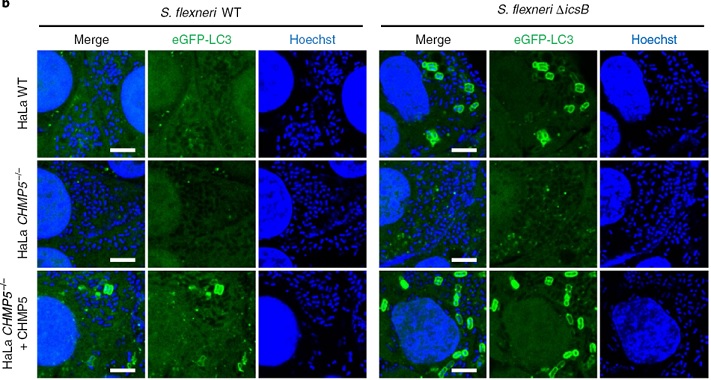 在上述研究中,研究人员注意到:(1)IcsB对Rho蛋白的识别并不依赖于一段独特的氨基酸序列,只是识别一段富含碱性氨基酸的区域及其C端被脂肪链修饰的CAAX motif,而具有这样特征的蛋白质在宿主细胞中其实有很多。(2)IcsB对Rho蛋白的修饰并不能解释其对多个宿主细胞通路均有抑制作用,特别是其对细胞自噬的抑制。考虑到这些问题,研究人员设计了巧妙的化学蛋白质组学的实验,将被IcsB修饰的、带有长链脂肪酰基的底物蛋白全部“抓”出来,再利用基于同位素的蛋白质定量质谱的方法鉴定出这些被修饰的蛋白。利用这个方法,他们发现在痢疾杆菌感染宿主细胞时,IcsB可以使至少60个左右的宿主蛋白发生长链脂肪酰基修饰,这些蛋白不仅包括此前鉴定出的Rho蛋白,还包括Ras和Rab家族的小G蛋白,以及SNARE和Septin家族等多个非小G蛋白。这些蛋白都具有一个富含碱性氨基酸的区域,在宿主细胞膜泡相关的多个通路中发挥重要调节作用。通过对这些蛋白进行逐一排查,研究人员最终发现IcsB是通过修饰CHMP5蛋白从而帮助痢疾杆菌抑制宿主细胞的抗细菌细胞自噬。