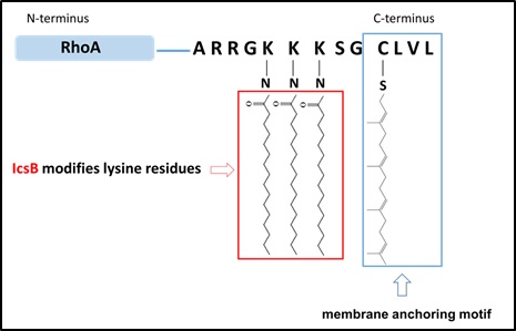 本研究首次发现志贺氏痢疾杆菌的毒力效应蛋白IcsB具有全新的脂肪酰基转移酶活性,不仅通过修饰Rho家族小G蛋白导致细胞内肌动蛋白纤维被破坏,而且也可以修饰其它Ras超家族的小G蛋白和SNARE等多个非小G蛋白,进而帮助痢疾杆菌抑制或调控多个细胞生理活动,促进其在宿主内生存和增殖。