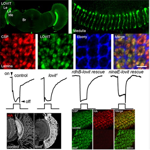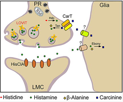 神经传导是突触前神经元释放神经递质递质并激活或抑制突触后神经元,这一进程依赖于神经递质运输并富集在突触小泡中。在本文中,作者通过靶向RNAi筛选鉴定了SLC45转运体家族的一个新成员,并将其命名为LOVIT(Loss Of VIsual Transmission)。LOVIT只在光感受器突触小泡中表达,loviT的突变体严重降低了光受体末端的组胺浓度并完全阻断视觉传导。果蝇光受体末端突触小泡中神经递质的回收依赖于LOVIT,这是维持果蝇视觉中高频率的组胺释放率所必需的。这些结果不仅鉴定了第一个组胺特异性囊泡转运蛋白,并证实了一种LOVIT依赖的维持组胺突触浓度的分子机制。其他物种也可能使用类似的转运机制来调节单胺类神经递质的合成和再生。