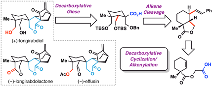 2019年5月15日,我所李超实验室()在《Journal of the American Chemical Society》杂志上在线发表题为“Tandem Decarboxylative Cyclization/Alkenylation Strategy for Total Syntheses of (+)-Longirabdiol, (-)-Longirabdolactone, and (-)-Effusin”的研究论文。该论文发现了一种金属铜催化的脱羧/环化/烯化串联反应,并成功地应用于C19位被氧化的贝壳杉烷型二萜的首次全合成。