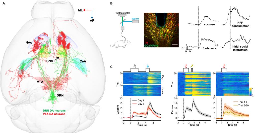 图1. 中缝背核多巴胺神经编码奖赏和惩罚信息。(A)全脑范围中缝背核多巴胺神经元单细胞重构;DRN: 中缝背核;VTA:伏隔核;BNST: 终纹床核;CeA: 杏仁核中部;(B)在体光线记录发现中缝背核多巴胺神经元被奖赏和惩罚所激活;(C)中缝背核多巴胺神经元对刺激的反应模式受学习过程影响。