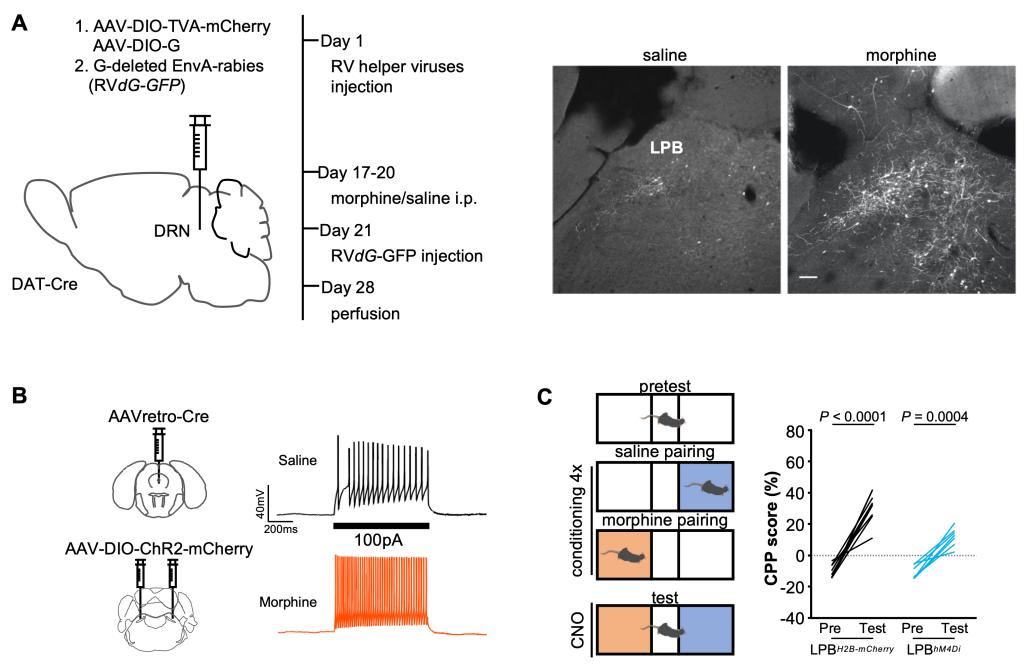 图4. 臂旁外侧核谷氨酸能神经元至中缝背核多巴胺能神经元通路调控奖赏记忆的表达。(A)基于狂犬病毒的全脑范围筛选鉴发现吗啡摄入增强臂旁外侧核到中缝背核多巴胺神经元的连接;(B)吗啡摄入增强投射到中缝背核的臂旁外侧核神经元兴奋性;(C)抑制臂旁外侧核到中缝背核通路降低吗啡摄入快感相关记忆的表达。