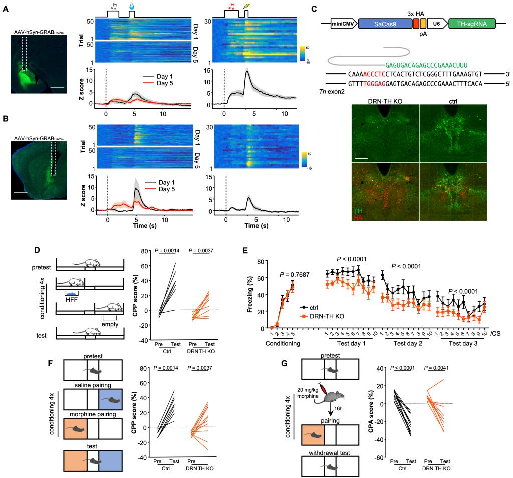 图3. 中缝背核多巴胺神经元所释放的多巴胺对记忆表达十分重要。(A-B) 利用遗传编码多巴胺荧光探针结合在体光纤记录技术检测在奖赏和惩罚行为中中缝背核多巴胺神经元在两个下游核团多巴胺的释放;(C) 腺相关病毒介导的CRISPR-Cas9在体基因编辑技术敲除中缝背核中的多巴胺合成;(D-G)敲出中缝背核中的多巴胺合成影响实验小鼠的奖赏与惩罚记忆以及阿片类药物成瘾记忆的表达。