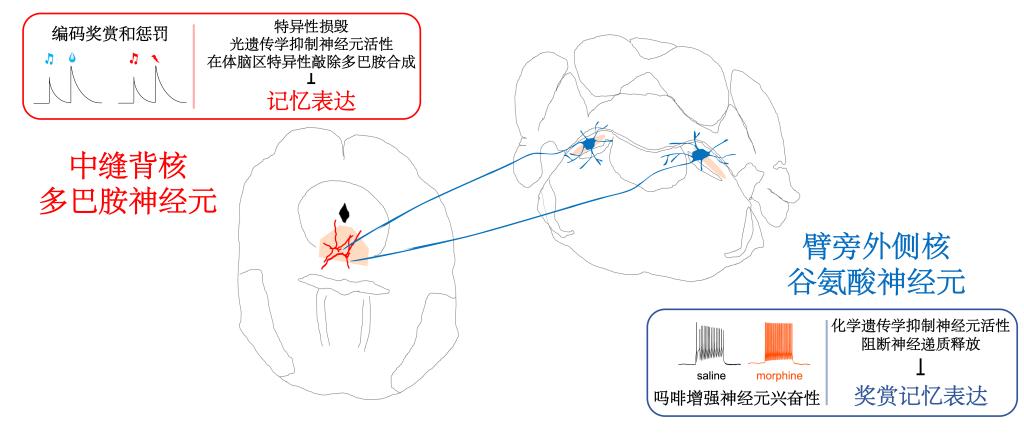 研究人员特异性地损毁或抑制中缝背核多巴胺神经元,发现中缝背核多巴胺神经元的缺失显著影响与食物奖励或电击惩罚相关记忆的表达。这些神经元也参与调控阿片类药物成瘾相关记忆的表达:当成瘾小鼠进入与吗啡相关的环境,中缝背核多巴胺神经元活性上升;损毁或抑制这些神经元显著影响与阿片类药物快感或药物戒断相关记忆的表达。