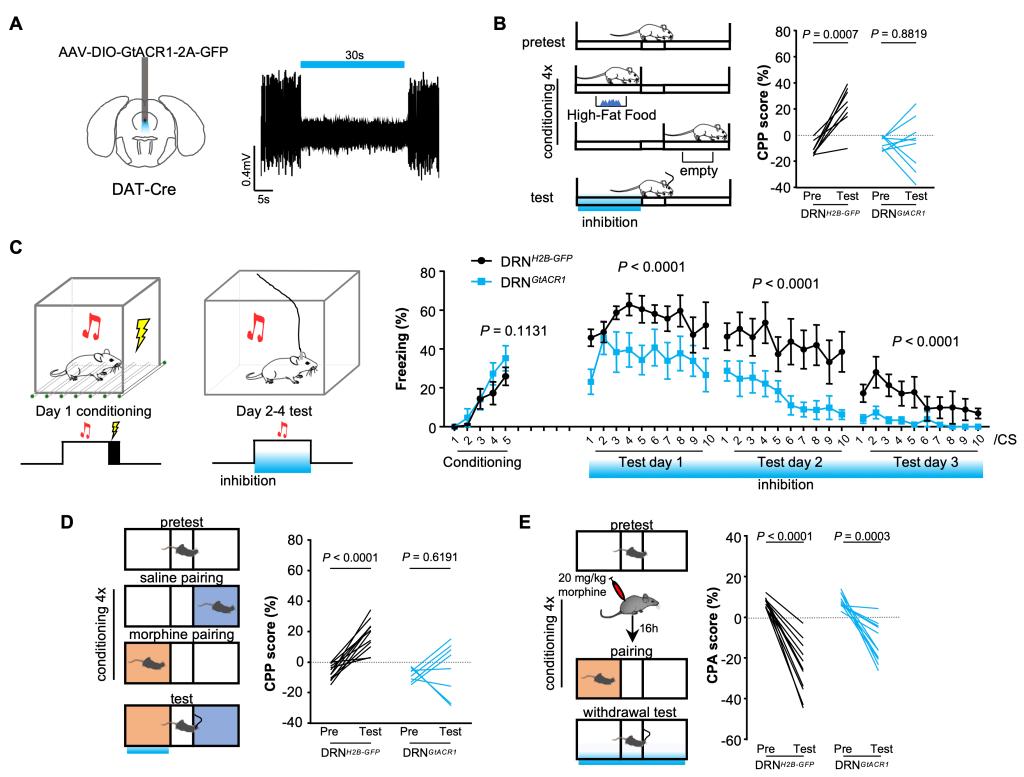 图2. 中缝背核多巴胺神经元调控记忆的表达。(A)光遗传学技术特异性抑制中缝背核多巴胺神经元活性;(B-E)抑制中缝背核多巴胺神经元活性影响与食物奖励或电击惩罚相关记忆以及损毁或抑制这些神经元显著影响与阿片类药物快感或药物戒断相关记忆的表达。
