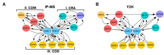 图1.拟南芥ISWI复合体的鉴定。(A)通过IP-MS检测到的三个亚型的ISWI复合物的亚基的蛋白质-蛋白质相互作用网络。(B)通过Y2H分析检测到的ISWI复合物亚基的蛋白质-蛋白质相互作用网络。
