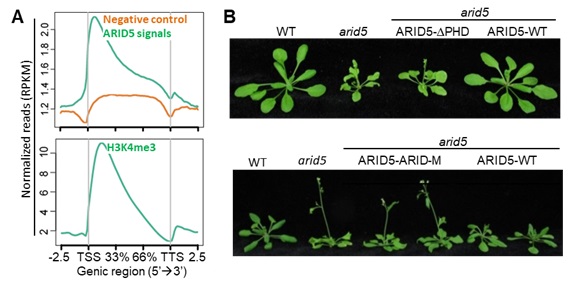 图4. ARID5结合组蛋白修饰H3K4me3富集基因区域调控开花时间。(A)ARID5富集基因上的ARID5和H3K4me3信号的平均分布模式。(B)WT,arid5以及在arid5背景下表达ARID5-WT,ARID5-ΔPHD和ARID5-ARID-M的转基因植物的形态。