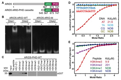 图2. ARID5与DNA及H3K4me3组蛋白的结合能力测定。(A,B)EMSA检测ARID5与含AT碱基的DNA1和DNA2结合。(C)利用pull down检测ARID5与H3K4me3的结合。(D)通过ITC检测ARID5的ARID-PHD区域与DNA的结合能力。(E)利用ITC检测ARID5的ARID-PHD区域与H3K4me3组蛋白的结合能力。