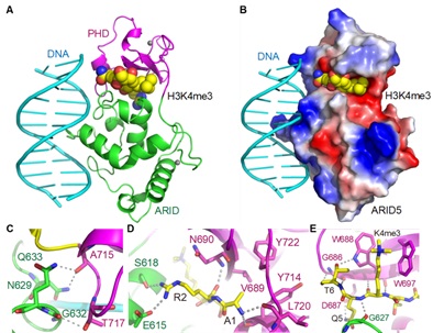 ARID5包含一个推测的ARID结构域和与其相邻的PHD结构域。利用生化和蛋白研究方法发现,ARID5的ARID结构域能够结合双链DNA;与其相邻的PHD结构域特异识别组蛋白修饰 H3K4me3而不识别未修饰的组蛋白或其它修饰的组蛋白(图2A-2C)。通过与南方科技大学的杜嘉木实验室的合作研究,发现ARID5蛋白的ARID-PHD双结构域能够协同作用结合H3K4me3及包含AT的DNA(图2D,2E),得到了ARID-PHD、DNA、H3K4me3形成的三元复合体,解析了其高分辨率的晶体结构 (图3A-3E)。结构分析发现,ARID5的PHD结构域中的Trp688和Trp697形成的笼状结构负责与H3K4me3的三甲基赖氨酸的特异结合,另外其PHD和ARID能够通过氢键与H3K4 周围的氨基酸残基结合,从而增强ARID5与H3K4me3组蛋白肽段的结合(图3A-3E)。ARID主要与DNA骨架上磷酸基团结合,另外ARID的T648能够通过氢键与DNA识别位点中央的AT碱基结合,这揭示了ARID识别富含AT碱基的DNA的分子机制。