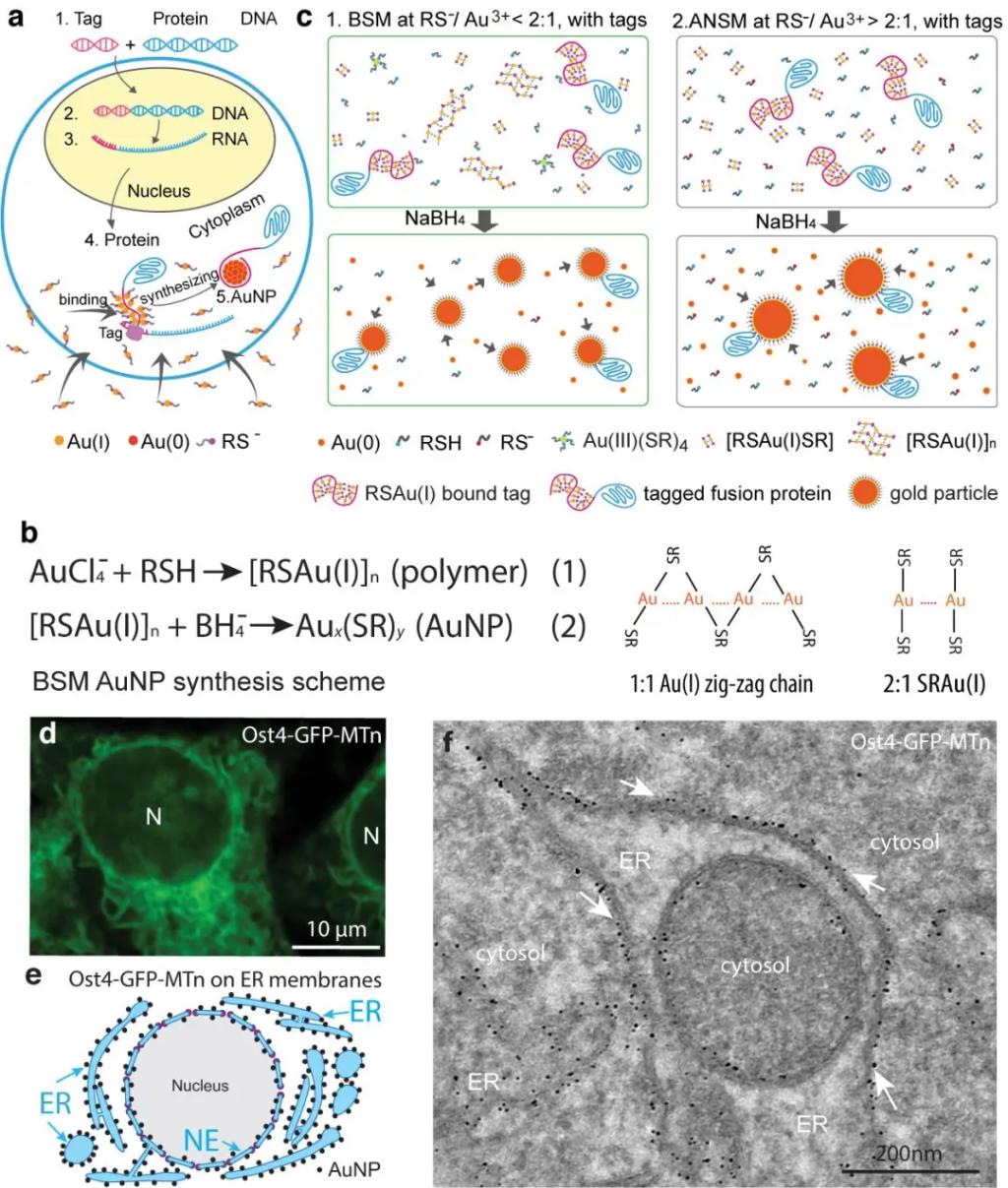 a.可克隆电镜标记技术概念图。b.Brust-Schiffrin方法(BSM)合成纳米金颗粒原理,及一价金离子与硫醇的两种结合方式(1:1和2:1模式)。c.经典的BSM合成条件下(1)富半胱氨酸标记蛋白和1:1一价金硫醇盐聚合物均可同时形成金颗粒,何万中研究组发现了一种自成核抑制机制(ANSM)可以在可溶的2:1一价金硫醇盐条件下(2)特异性地在标记蛋白上合成纳米金颗粒(完全抑制非标记自成核金颗粒背景噪声)。d.稳定表达Ost4-GFP-MTn的HeLa细胞的荧光显微像。e.预期Ost4-GFP-MTn蛋白上成功合成纳米金颗粒后在内质网(ER)膜上的定位图。f. 用基于ANSM的可克隆电镜标记技术处理过的HeLa细胞(表达Ost4-GFP-MTn)切片的电镜照片,显示高密度的纳米金颗粒成功定位于朝向细胞质的ER膜上。