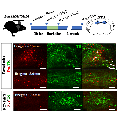 为了寻找孤束核是否存在感知“饥”信号的神经元,研究人员首先利用FosTrap2:Ai14小鼠和免疫荧光技术,确认饥饿可以激活NTS脑区的儿茶酚胺能神经元(简称CA神经元)。