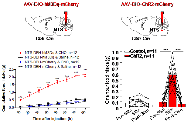 并且,通过化学遗传学和光遗传学的方法激活孤束核CA神经元,可以明显促进小鼠进食。而通过光遗传学抑制孤束核CA神经元,则大大降低饥饿诱导的进食增加。因此, 孤束核CA神经元是一群可以响应饥饿信号并促进食欲的神经元。
