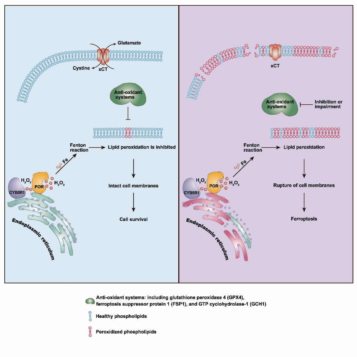 细胞铁死亡在细胞内GPX4、FSP1、xCT、GCH1等抗氧化系统被药物学或者遗传学手段抑制时发生。GPX4(谷胱甘肽过氧化酶4)以GSH(谷胱甘肽)为还原剂,催化脂质过氧化物还原成对应的醇,从而保护细胞免受脂质过氧化损伤。FSP1(铁死亡抑制蛋白1)催化CoQ10转化成ubiquinol,后者是亲脂的抗氧化剂,能够中和脂质过氧化物。xCT是cystine-glumate antiporter(胱氨酸-谷氨酸-逆转运蛋白)的功能亚基,抑制其功能减少cystine转入,导致细胞中cysteine缺乏,造成GSH和CoQ10的减少从而削弱细胞的抗氧化功能。GCH1(GTP依赖的环水解酶1)通过合成亲脂的,具有抗氧化能力的生物蝶呤,增强细胞膜抵抗氧化损伤的能力,也能保护细胞免受铁死亡。虽然大量的研究对细胞还原系统(抗氧化系统)进行了报导,但是对造成细胞铁死亡的脂质过氧化过程中的氧化系统知之甚少,甚至争议不断。