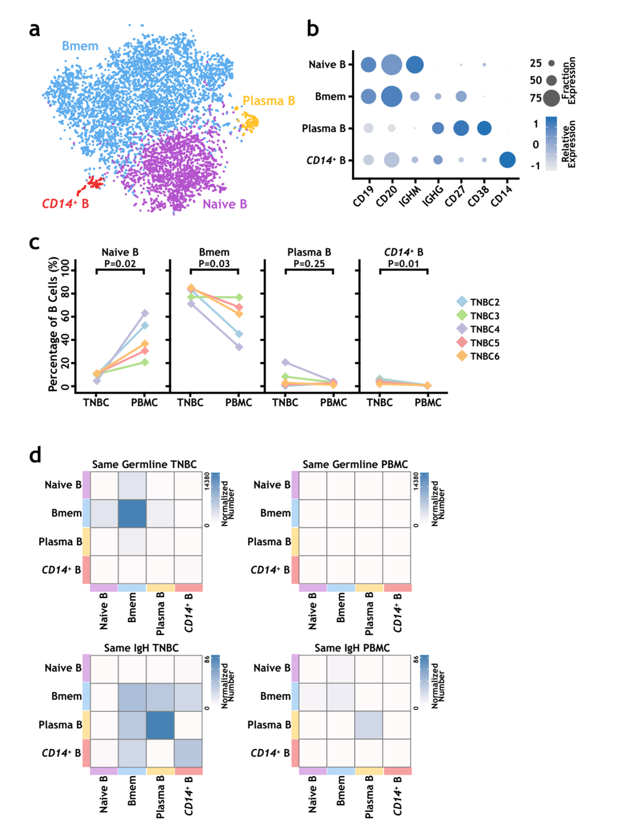 图1. a. TNBC病人中4个B细胞亚群的tSNE图展示;b. marker基因表达情况;c. 4个B细胞亚群在PBMC和TNBC组织中分布;d.热图展示4个B细胞亚群之间的相同 IGH germline 次数(上)和相同IGH序列次数(下)
