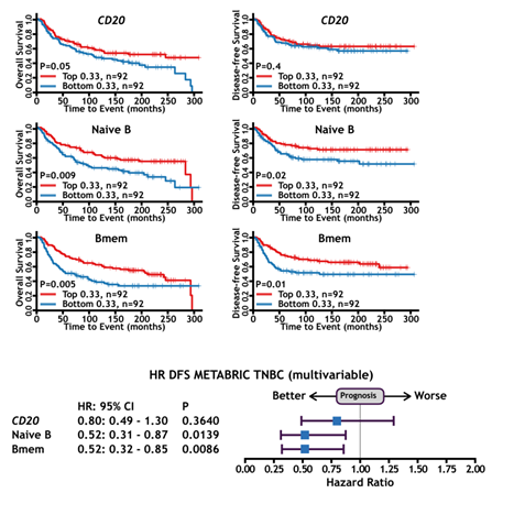 图3. CD20, naïve B细胞特征基因和memory B细胞特征基因在METABRIC数据库中TNBC病人的Kaplan–Meier生存曲线(上图左侧Overall survival, 上图右侧Disease Free Survival)和Hazard Ratios(下图)