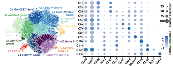 图2. TNBC病人的13个B细胞亚群的tSNE图展示(左图)和marker基因表达情况(右图)