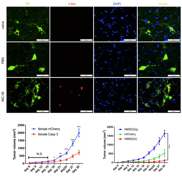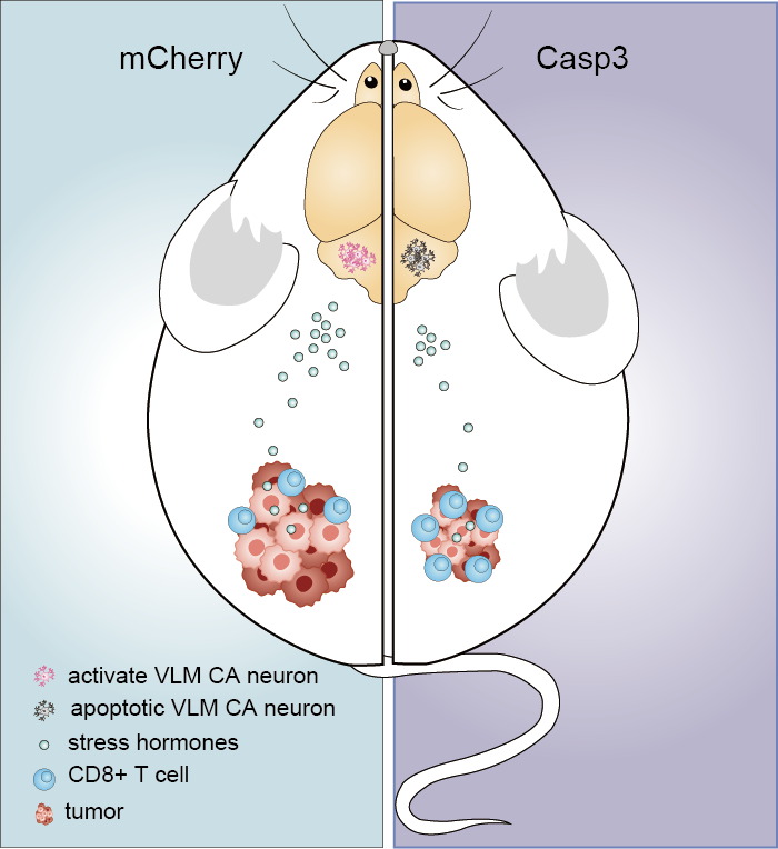 长久以来,病人的精神状况会影响肿瘤的生长的说法在民间纷纷不绝。但从严谨的科学角度,肿瘤的生长是否会受到神经系统的影响,如何影响,中枢神经系统又是如何感知身体上的肿瘤并通过哪种生理系统对肿瘤施加影响?2021年7月13日,我所王晓东实验室在《PNAS》杂志在线发表题为“VLM catecholaminergic neurons control tumor growth by regulating CD8+ T cells”的文章。文章报道了小鼠中枢神经系统中对压力应激的位于腹外侧髓质的儿茶酚胺(VLM CA)神经元对肿瘤调控的机制。在该论文中,研究人员首先发现接种了肿瘤的小鼠VLM CA神经元会激活,表示这类压力应激神经元可以感受身体中的肿瘤并作为压力(Stress)信号传递的脑内。研究人员然后通过把可以诱导细胞凋亡的腺相关病毒特异的注射到VLM神经元的脑区并通过此类神经元中特殊的酶激活凋亡。AAV-Casp3病毒特异性杀伤VLM CA神经元后研究人员发现肿瘤生长速度减慢并能显著延长荷瘤小鼠的存活期。他们然后通过使用化学遗传学工具进一步发现直接激活VLM CA神经元可以促进肿瘤生长,而抑制VLM CA神经元的活性则可以抑制肿瘤过度生长的表型。进一步研究发现VLM CA神经元对调节肿瘤的进展是通过调节CD8+ T细胞而实现的。VLM CA神经元缺失的小鼠,其瘤内和脾脏内CD4+、CD8+ T细胞的数量都显著增多,进一步通过使用免疫缺陷小鼠和CD4、CD8删除性抗体,发现该调节过程依赖于CD8+ T细胞。