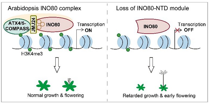 该研究表明,拟南芥INO80复合体的催化亚基INO80以及结合在INO80的NTD和ATP酶结构域的辅助亚基都能够促进植物的营养生长,它们的缺失会导致植株变小。与此一致,INO80的NTD及ATP酶结构域的缺失影响INO80转基因的互补功能,导致植株变小。这表明,在营养生长阶段,INO80复合体的NTD模块和ATP酶模块能够共同作用促进植物生长。在生殖生长阶段,NTD结构域及其结合亚基形成的NTD模块在短日照条件下抑制植物开花,而ATP酶结构域则促进植物开花。上述结果表明INO80的NTD具有不依赖ATP酶活性的调控作用,并对植物的正常生长发育以及开花至关重要。RNA-seq和H3K4me3 ChIP-seq分析结果显示,INO80的NTD能够通过其ATX4/5-COMPASS组分在特定靶基因上进行H3K4me3修饰,从而促进基因表达,且这一过程不依赖INO80的ATP酶活性(图2)。