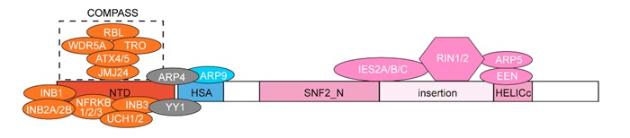 该研究通过亲和纯化联合质谱分析的方法系统地鉴定了拟南芥中INO80复合体的组分。研究发现,拟南芥INO80复合体至少包含26种蛋白亚基,其中部分亚基与动物相应亚基同源,其它亚基(INB1、INB2A、INB2B和INB3)为植物所特有。有趣的是,组蛋白H3K4甲基转移酶ATX4和ATX5所形成的COMPASS复合体能够与INO80蛋白共纯化,形成植物INO80复合体中特有的ATX4/5-COMPASS模块,而同属于ATX家族的ATX1、ATX2和ATX3在植物中形成独立的COMPASS复合体,不与INO80复合体结合。进一步研究发现,ATX4/5-COMPASS复合体通过一个组蛋白去甲基化酶家族蛋白—JMJ24特异性的与INO80的NTD结合,且植物中特异亚基—INB蛋白也结合在INO80的NTD,而与动物INO80复合体亚基同源的其它蛋白则分别与INO80的三个结构域结合(图1)。