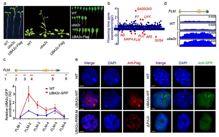 图1 UBA2c通过促进FLM转录控制开花时间的分子机制。a:uba2c突变体的表型;b:uba2c突变体对开花时间调控基因表达的影响;c: ChIP-qPCR检测UBA2c-GFP在FLM染色质上的富集;d: UBA2c调控FLM上的H3K27me3修饰水平;e: UBA2c-WT,UBA2c-RRM-M, UBA2c-ΔPrLD 在细胞核上的定位。
