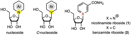 C-核苷及其类似物是呋喃糖与碱基以C-C键相连的一类化合物,这类化合物具有很好的抗生物降解稳定性,通常具有抗菌,抗病毒,抗肿瘤等多种生物学活性。近年来这类化合物在药物化学、化学生物学以及合成生物学中呈现出很高的潜在应用价值。例如苯甲酰胺核苷,作为一种天然烟酰胺核苷的C-核苷类似物,可以通过抑制肌苷5'-单磷酸脱氢酶(IMPDH)发挥抗肿瘤活性。然而,现有的C-芳基核苷类化合物的合成方法在原料获得,底物适用范围和立体选择性方面仍然有很大的局限性。