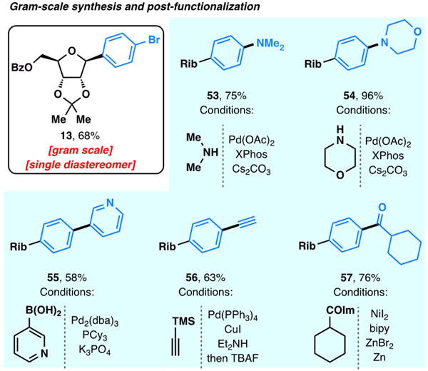 值得注意的是,此方法对芳基碘化物具有独特的化学选择性,这也使得这种方法可以用于有效地制备适用于多种后期官能团转化的碳-溴代芳基-呋喃糖。例如,作者以克级规模合成了C-芳基溴-呋喃糖苷13,并在此基础上进行了一系列官能团化的反应,包括Buchwald-Hartwig胺化、Suzuki-Miyaura偶联、Sonogashira偶联以及镍催化的酰化反应。这种化学选择性可以很好的拓展C-芳基核苷类似物的化学合成空间。