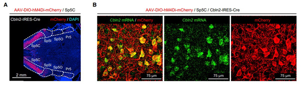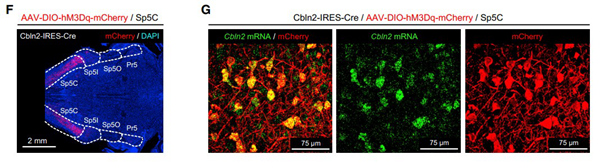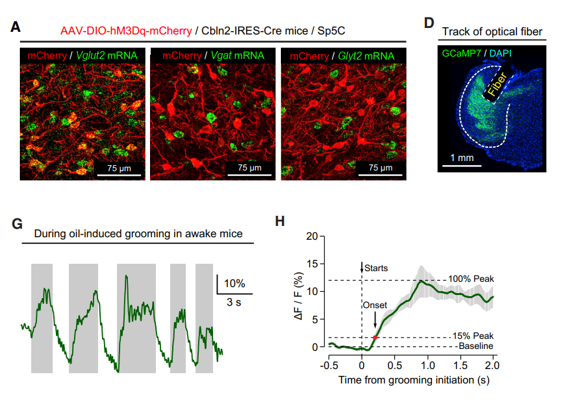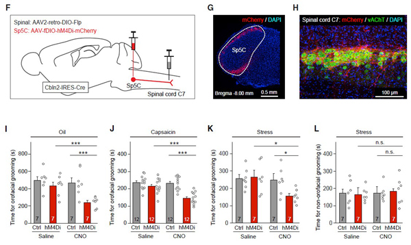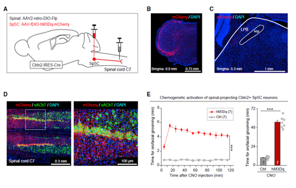 通过在Cbln2-IRES-Cre小鼠的Sp5C注射AAV-fDIO-hM3Dq-mCherry,在脊髓注射AAV2-retro-DIO-Flp,腹腔注射CNO,研究者发现特异性化学遗传激活Sp5C向脊髓投射的Cbln2+神经元能够引起小鼠重复性面部自我梳理行为。