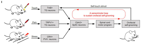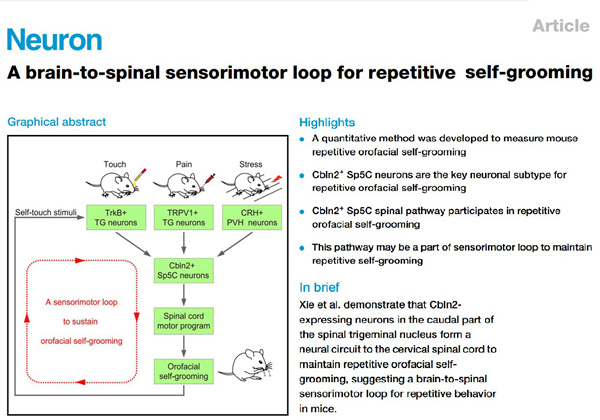 /北京生命科学研究所的曹鹏实验室在神经科学著名刊物Neuron上在线发表了题为A brain-to-spinal sensorimotor loop for repetitive self-grooming的研究论文。该研究发现,在三叉神经脊髓核的尾侧部(caudal part of the spinal trigeminal nucleus,Sp5C),表达小脑素-2 (Cerebellin-2, Cbln2)的神经元形成一条向脊髓投射的下行神经通路,在维持自我梳理的重复刻板行为中扮演了重要的角色。Cbln2+ Sp5C神经元的失活阻断了感觉诱发和压力诱发的重复性自我梳理行为。这些神经元的激活则触发了类似自我梳理行为的重复前肢运动。研究者进一步证明,Cbln2+ Sp5C神经元接受来自三叉神经节感觉神经元和下丘脑室旁核神经元的输入。Cbln2+ Sp5C神经元形成一条向脊髓投射的下行通路,支配脊髓颈段的运动神经元和中间神经元,是自我梳理重复刻板行为的充分且必要条件。这些研究结果表明,脑与脊髓的协同在重复刻板行为中扮演了重要角色。作者最后提出了一个有趣的闭环神经机制模型:每次自我梳理将再次激活小鼠的Cbln2+ Sp5C神经元,并进一步促进下一个周期的自我梳理行为,形成了一个反馈式的闭环神经机制来维持重复刻板行为的发生。
