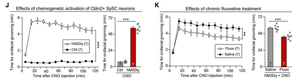 接下来,研究者对Cbln2-IRES-Cre小鼠的Sp5C注射AAV-DIO-ChR2-2A-mCherry病毒并包埋光纤。他们发现,光激活Cbln2+ Sp5C神经元能够引发小鼠类似面部自我梳理的重复性前肢运动。经过定量分析,发现这一运动的频率依赖于激光的强度和频率。研究者进一步发现,化学遗传学激活Cbln2+ Sp5C神经元也可以引起小鼠重复刻板的面部自我梳理行为,使用抗抑郁药物弗西汀(fluoxetine)可以减少这一行为的持续时间。
