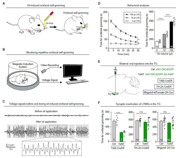 然后,研究者使用不同体积的玉米油诱导小鼠面部自我梳理,发现该行为的持续时间依赖于玉米油的体积。研究者进一步通过对TrkB-CreER、TH-2A-CreER、Mrgprb4-TdTomato-2A-Cre小鼠的三叉神经节(trigeminal ganglion, TG)双侧注射AAV-DIO-EGFP-2A-TeNT载体失活特定类型神经元,发现三叉神经节中负责感受触觉刺激的TrkB+神经元失活能显著降低玉米油诱导的自我梳理行为的持续时间,说明三叉神经节中负责触觉的TrkB+神经元参与了玉米油诱导的重复性自我梳理行为。