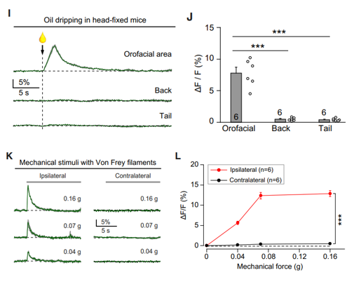除此之外,他们还对向脊髓投射的Cbln2+ Sp5C神经元进行了面部自我梳理行为的光纤记录,观察到了钙信号的显著上升,同时这些神经元对同侧面部的机械刺激也表现出明显的钙信号反应。这些数据表明,向脊髓投射的Cbln2+ Sp5C神经元编码了同侧面部的机械刺激。