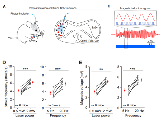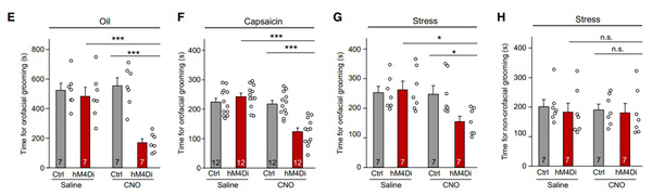首先,研究者使用三种不同的外部刺激诱导重复性自我梳理行为,分别对应:面部滴加玉米油——感觉刺激,面部皮下注射辣椒素——化学刺激,足底电击——压力应激刺激。三种刺激方法均能引起小鼠针对面部的重复性自我梳理行为。为了对这些行为进行定量分析,研究者在小鼠前肢包埋微型磁铁,并将其置于电磁场中,产生的电磁信号能够跟踪重复的前肢体运动,进而代表重复的自我梳理行为。