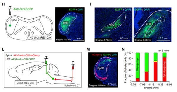 图7 脊髓投射Cbln2+ Sp5C神经元的特征 (图片引自:Xie et al., Neuron 2021)