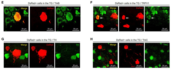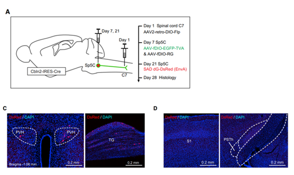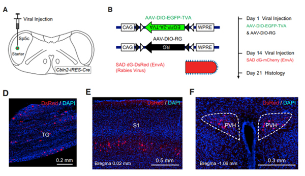 最后,研究者通过狂犬病毒示踪的方法追踪向脊髓投射的Cbln2+ Sp5C神经元的上游。他们发现这些神经元可能整合了来自TG的TrkB+神经元、TRPV1+神经元、以及来自PVH神经元的输入。