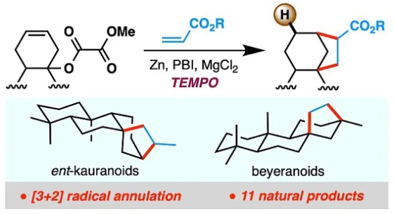 在天然产物全合成研究中,自由基环化反应是构建复杂环系的有力工具。这项研究工作中,作者发现TEMPO能促进[3+2]自由基环化反应,并以中等收率一步构建[3.2.1]桥环结构。这个反应缩短了合成的线性步骤,提高了合成效率。这对后续合成具有[3.2.1]桥环骨架结构的天然产物提供了可参考的方法。