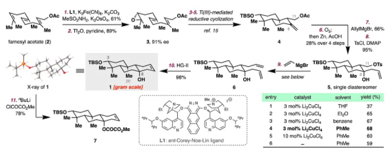 基于以上考虑,作者首先设计了一条高效合成高烯丙醇1的合成路线(图4)。从已知的化合物反式/反式金合欢醇乙酯出发,经不对成双羟化、环氧化以及三价钛介导的还原环化得到十氢萘化合物4。臭氧解环外双键生成酮,然后用烯丙基溴化镁对所得酮进行1,2-加成并同时脱除C11处的乙酰基,随后选择性地对伯醇进行甲苯磺酰化得到化合物5。该化合物在小极性溶剂甲苯和铜的催化作用下与乙烯基溴化镁发生Kochi-Schlosser偶联得到6。最后通过RCM反应得到高烯丙基三级醇1,化合物1的结构通过X-ray得到证实。这条路线能实现化合物1的克级制备。