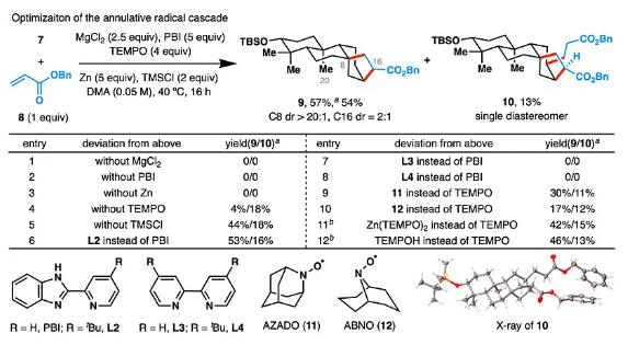 在获得化合物1后,作者开始探索[3+2]自由基环化反应。上海大学的龚和贵教授在2019年首次报道了三级醇草酸甲酯在PBI、MgCl2和锌粉的作用下能产生三级自由基(J. Am. Chem. Soc.,2019,141, 820–824)。受此启发,作者通过大量的反应条件筛选,最终发现以稳定的高烯丙基三级醇草酸甲酯7为原料、锌粉为还原剂、PBI为配体、氯化镁、TEMPO以及TMSCl为添加剂,可以获得可观收率的目标产物9(图5)。对照试验表明锌粉、PBI、MgCl2以及TEMPO都是必须的(entry 1-4),将PBI换成其它的氮配体或者将MgCl2换成ZnCl2,反应都不会发生。