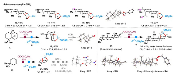 随后,作者对其底物使用范围进行了考察(图7)。除了丙烯酸苄酯外,丙烯氰和丙烯酸乙酯也可以较好的收率得到化合物13和14。不同氧化态的高烯丙醇1衍生物(15和16)、简单的二环(17)、单环底物(20)以及链状的高烯丙醇也适用于该反应。值得注意的是,化合物23形成的草酸甲酯在标准条件下产生的三级自由基与缺电子双键反应时倾向于从位阻大的一侧与双键加成。虽然具体的原因尚不清楚,但庆幸的是主产物的立体构型与贝叶烷二萜天然产物相同。