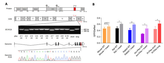 考虑到高原鼠兔长期生活在低氧的条件下,而低氧信号通路又与生物钟息息相关,研究人员分析了高原鼠兔与平原地区哺乳动物(如家兔、大鼠、小鼠、人等)缺氧诱导因子(HIF)家族蛋白编码基因的序列,发现高原鼠兔Epas1基因(编码Epas1蛋白,又称HIF-2α)第14个内含子5’端存在一个特异的G>A的点突变。RT-PCR结果表明,该突变会改变Epas1mRNA的剪接方式,产生增加了72个碱基的转录本以及增加了24个氨基酸的蛋白(下称L-Epas1,未突变的蛋白称为S-Epas1)。这一突变在弱节律的高原鼠兔中以杂合形式存在,在无节律的个体中则以纯合形式存在。全局蛋白质稳定性(Global protein stability, GPS)分析表明,与S-Epas1相比,L-Epas1蛋白在缺氧条件下更加稳定。此外,向家兔、大鼠、小鼠的Epas1蛋白中插入相同的24个氨基酸片段也会提高蛋白质的稳定性(图3)。