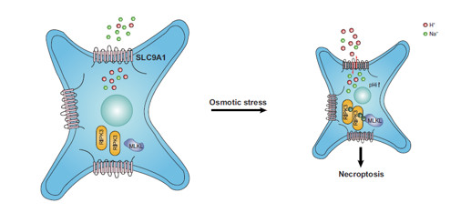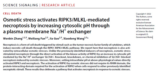 长期以来,王晓东实验室深耕于包括程序性细胞凋亡(apoptosis)和程序性细胞坏死(necroptosis)在内的程序性细胞死亡信号通路的研究,先后发现了细胞坏死的关键调控蛋白RIPK3(4)和MLKL(5)。2022年5月17日,王晓东实验室在Science Signaling杂志上发表了题为“Osmotic stress activates RIPK3/MLKL-mediated necroptosis by increasing cytosolic pH through a plasma membrane Na+/H+exchanger”的研究成果,揭示了高渗应激诱导细胞死亡的分子机制—高渗应激通过诱发RIPK3介导的程序性细胞坏死导致细胞死亡。