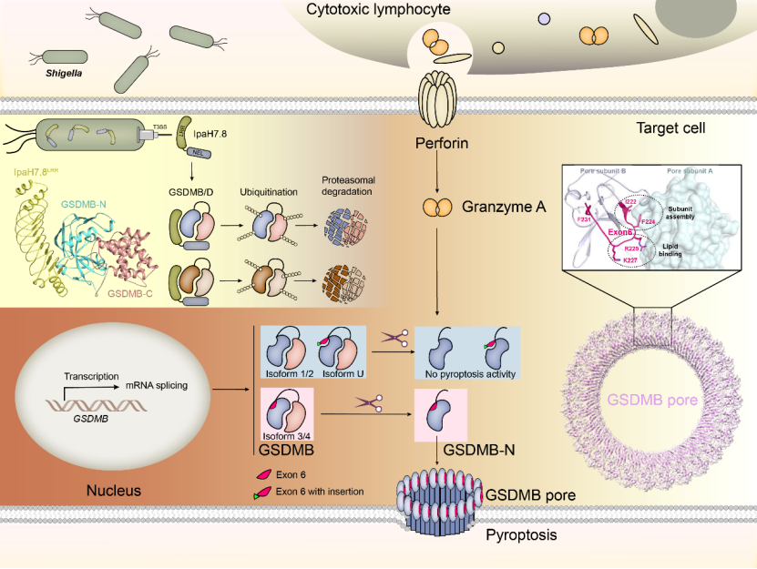 /北京生命科学研究所邵峰团队在2020年发现,细胞毒性淋巴细胞分泌的颗粒酶A(GZMA)特异地切割和活化靶细胞内gasdermin家族的成员GSDMB,通过GSDMB N端结构域的膜打孔活性引起靶细胞焦亡(1)。2021年一篇发表在Cell上的研究报道了痢疾杆菌感染的肠上皮细胞中GSDMB虽然能被GZMA切割活化,但GSDMB并没有引发细胞焦亡,而是通过其N端结构域直接在细菌细胞膜上打孔来杀菌,并且他们发现痢疾杆菌分泌的效应蛋白IpaH7.8能够介导GSDMB的泛素化降解,从而拮抗宿主的这种免疫防御机制(2)。而另一项研究则认为IpaH7.8能够在人体肠上皮细胞中识别和降解焦亡蛋白GSDMD从而逃逸宿主的天然免疫防御(3)。2022年发表在Cell的一项工作也没有检测到GSDMB N端结构域介导细胞焦亡的活性, 而认为全长的GSDMB蛋白具有调控肠上皮细胞增殖和迁移的功能,帮助肠上皮维持结构和修复损伤(4)。