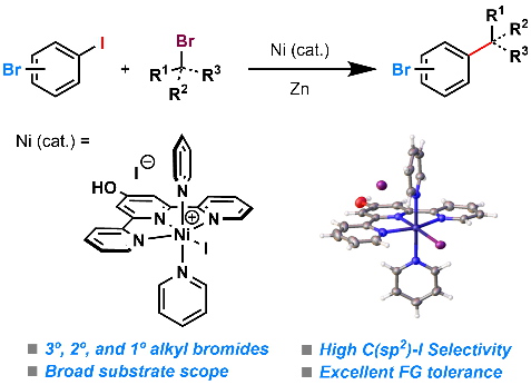 /北京生命科学研究所的李超课题组(www.lichaolab.com)在Angew. Chem. Int. Ed.杂志上在线发表题为“Nickel-Catalyzed C–I-Selective C(sp2)–C(sp3) Cross-Electrophile Coupling of Bromo(iodo)arenes with Alkyl Bromides”的研究论文。该论文报道了以烷基溴化物和溴碘代芳烃为底物,在金属镍和富电子三齿配体的催化作用下,化学选择性地在C(sp2)–I处发生还原偶联,生成带有包括三级烷基在内的多种烷基侧链的芳基溴化物。