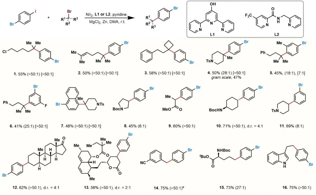 本篇论文介绍了一种新的方法,可以将烷基溴化物和溴碘代芳烃作为底物,在金属镍和富电子三齿配体的催化作用下,化学选择性地在C(sp2)–I处发生还原偶联,生成带有包括三级烷基在内的多种烷基侧链的芳基溴化物。该种还原偶联策略具有广泛的底物适用范围,对于三级烷基溴化物和含有各种取代基的溴碘代芳烃,都能以优异的C(sp2)–I选择性和中等以上的收率构建带有溴代芳基的季碳中心。同时,一级和二级烷基溴也可以被应用于该反应。在官能团耐受性方面,该反应可兼容酯基,酰胺,羰基,醚,硅基,Boc, Ts, 以及未保护的吲哚等官能团。