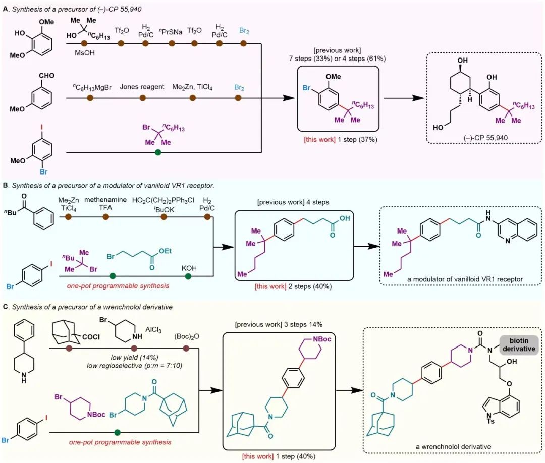 除此之外,作者运用该方法,实现了不同的烷基溴化物和溴碘代芳烃的一锅式迭代还原偶联反应,实现了对芳环的“程序化编辑”。更重要的是该方法还被应用于简化一些生物活性分子的合成,如下图所示,在大麻素类似物(–)-CP55,940和辣椒素受体调节剂中间体的合成中,该方法可以将原有的4~7步的路线缩短到1~2步;在扳手醇类似物的合成中,该方法可替代原有低区域选择性Friedel-Crafts烷基化反应。这体现出了这种方法的优异步骤经济性和实用性。