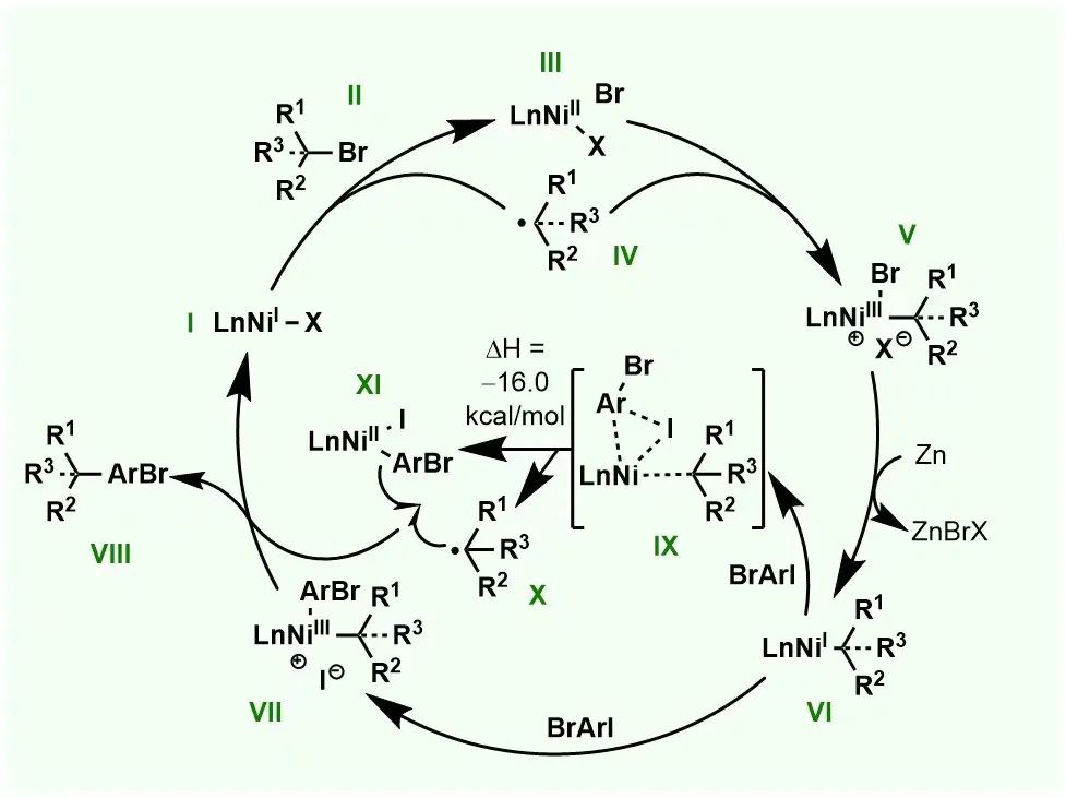 机理研究表明:在该反应条件下,锌粉只能将NiII还原到NiI,并且催化活性物种对烷基溴的活化要先于对对溴碘苯的氧化加成,这与传统的还原偶联反应机理有所不同。结合其他大量的机理实验和DFT计算,作者提出了可能的反应机理:NiI配合物I通过单电子转移过程活化烷基溴化物,生成NiII配合物III和烷基自由基IV。其次,NiII配合物捕获烷基自由基生成NiIII配合物V,该配合物被锌粉还原后生成NiI–烷基配合物VI。随后在三级烷基–NiI配合物与芳基碘作用的过程中,由于三级烷基自由基较大的空间位阻,导致在氧化加成中会首先通过过渡态IX形成三级自由基X和NiII芳基配合物XI,再通过一个外层自由基结合的机理生成季碳产物VIII。而对于一级和二级烷基–NiI配合物来讲,其可以通过与芳基碘发生直接氧化加成生成NiIII络合物VII,最后经还原消除生成目标产物。相关DFT计算也揭示了溴/碘选择性产生的原因。