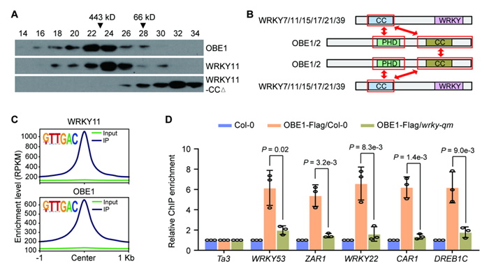 该研究通过蛋白免疫亲和纯化结合质谱分析, 发现拟南芥中的IId类WRKY转录因子能够与OBE家族蛋白互作形成一类新的植物特异的蛋白复合体,该研究将这类复合体命名为WRKY-OBE复合体。进一步研究发现,IId类WRKY转录因子的N-端区域包含一段高等植物中保守的coiled-coil(CC)结构域,该结构域负责与OBE蛋白的结合。两个OBE蛋白之间能够互作形成二聚体,并分别结合一个WRKY蛋白,从而形成一个包含两个OBE蛋白和两个WRKY蛋白的四亚基WRKY-OBE复合体(图1)。另外,OBE家族蛋白OBE1的PHD结构域能够特异性识别组蛋白H3K4me2/3修饰,同时OBE1能够通过与OBE2互作增强其对组蛋白的结合能力,揭示了组蛋白参与WRKY-OBE复合体转录调控功能的可能分子机制。