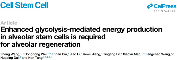 /北京生命科学研究所汤楠实验室在Cell Stem Cell杂志在线发表了题为“Enhanced glycolysis-mediated energy production in alveolar stem cells is required for alveolar regeneration”的研究论文。该研究揭示了调控肺泡干细胞分化的机制,并解析了衰老如何导致肺泡再生障碍。