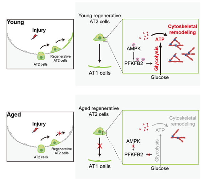 综上所述,该研究利用衰老诱导肺泡再生障碍的动物模型,解释了为什么随着年龄增长,肺泡再生受损现象会变得更加普遍,揭示了肺泡干细胞分化过程中能量代谢的重要性。肺组织损伤后,响应显著改变的力学环境和再生信号,肺泡干细胞需要快速调整其新陈代谢,为其分化提供足够的能量。AMPK-PFKFB2信号通路通过调控糖酵解介导的能量代谢,在肺泡干细胞分化中发挥关键调控作用。肺泡干细胞的功能紊乱与多种肺疾病的发生具有密切联系,促进肺泡再生对于肺泡疾病和纤维化消退的治疗具有重要意义。本研究通过小分子化合物或遗传学方法激活AMPK-PFKFB2信号通路,证实能够有效促进衰老干细胞的再生功能,为临床开发衰老相关肺部疾病的治疗方法提供了一个重要方向。
