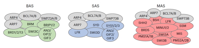 该研究通过亲和纯化联合质谱分析,在拟南芥中鉴定到BAS(BRM-associated SWI/SNF)、SAS (SYD-associated SWI/SNF)和MAS(MINU1/2-associated SWI/SNF)三类SWI/SNF染色质重塑复合体并区分了它们所包含的共同亚基和特异亚基(图1),同时发现水稻中也包含三类SWI/SNF复合体,具有与拟南芥SWI/SNF复合体保守的分类和亚基组成,揭示了植物中SWI/SNF复合体的保守性。