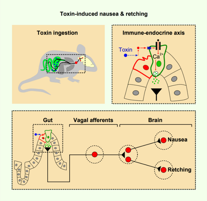 要想阐明大脑启动“恶心-呕吐”反应的机制,除了要有合适的动物模型和研究范式外,还需要解开三个长期未解的谜团。第一,胃肠道遭受病原入侵后,究竟是哪类肠道细胞把这一重要的情报交给了迷走神经?第二,迷走神经中负责与肠道“情报员”对接的感觉神经元具有怎样的身份和特征?第三,当大脑接到迷走神经传来的病原入侵的情报后,如何快速同步地启动恶心和呕吐等一系列防御反应?